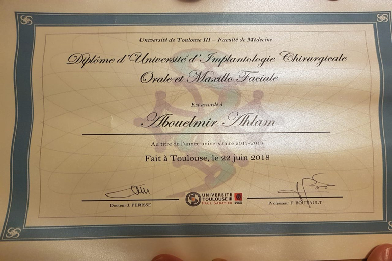 - Certificat d'étude supérieure en Implantologie à Casablanca.